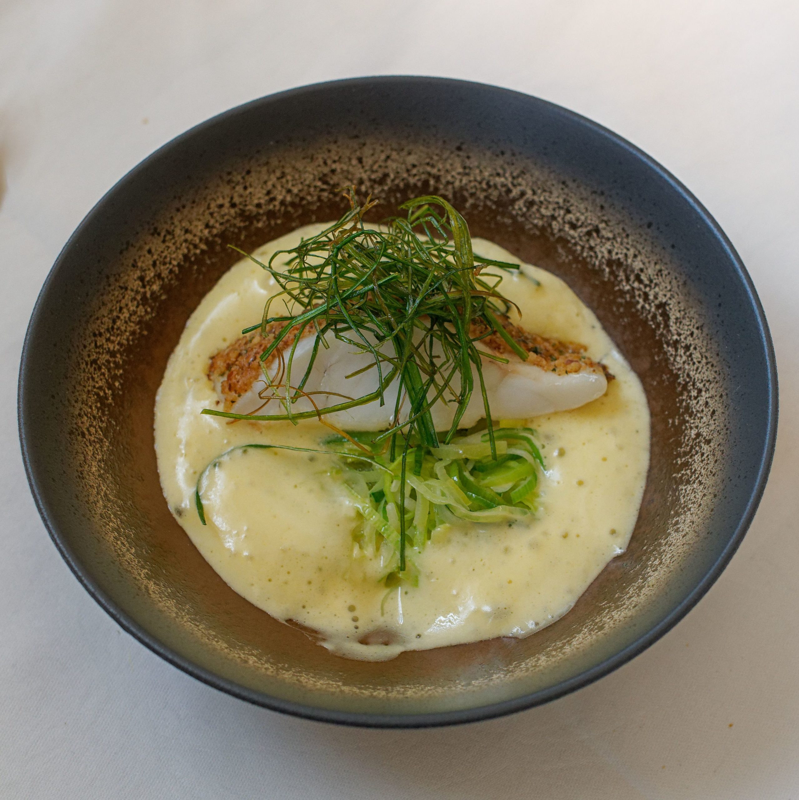 Sandre en viennoise de bretzel.fine purée de marabel fumée / poireaux / hollandaise siphon