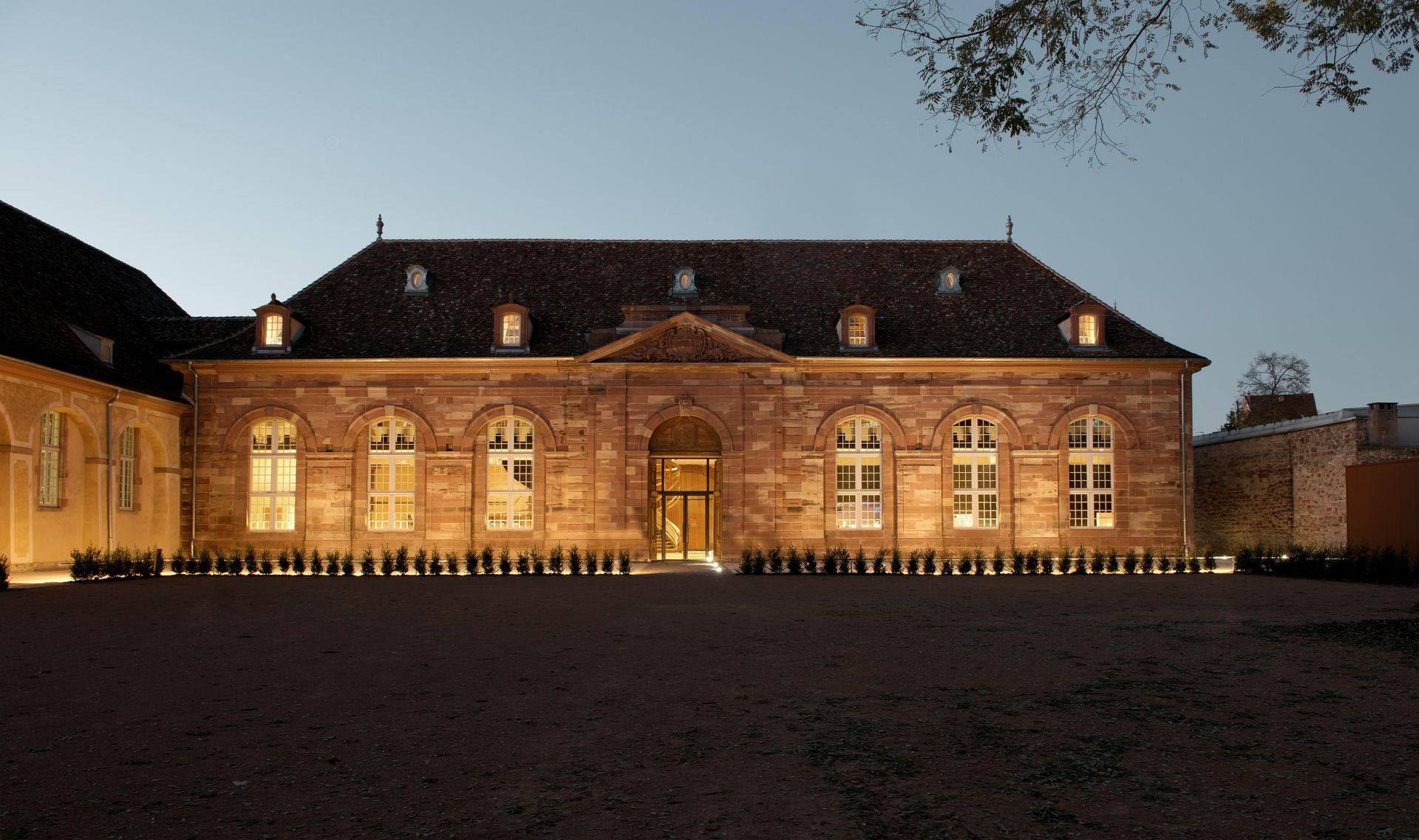 L’été, dans la paisible cour intérieure des Haras, une vaste terrasse prend place devant la somptueuse façade en grès des Vosges, classée au patrimoine de l’UNESCO.