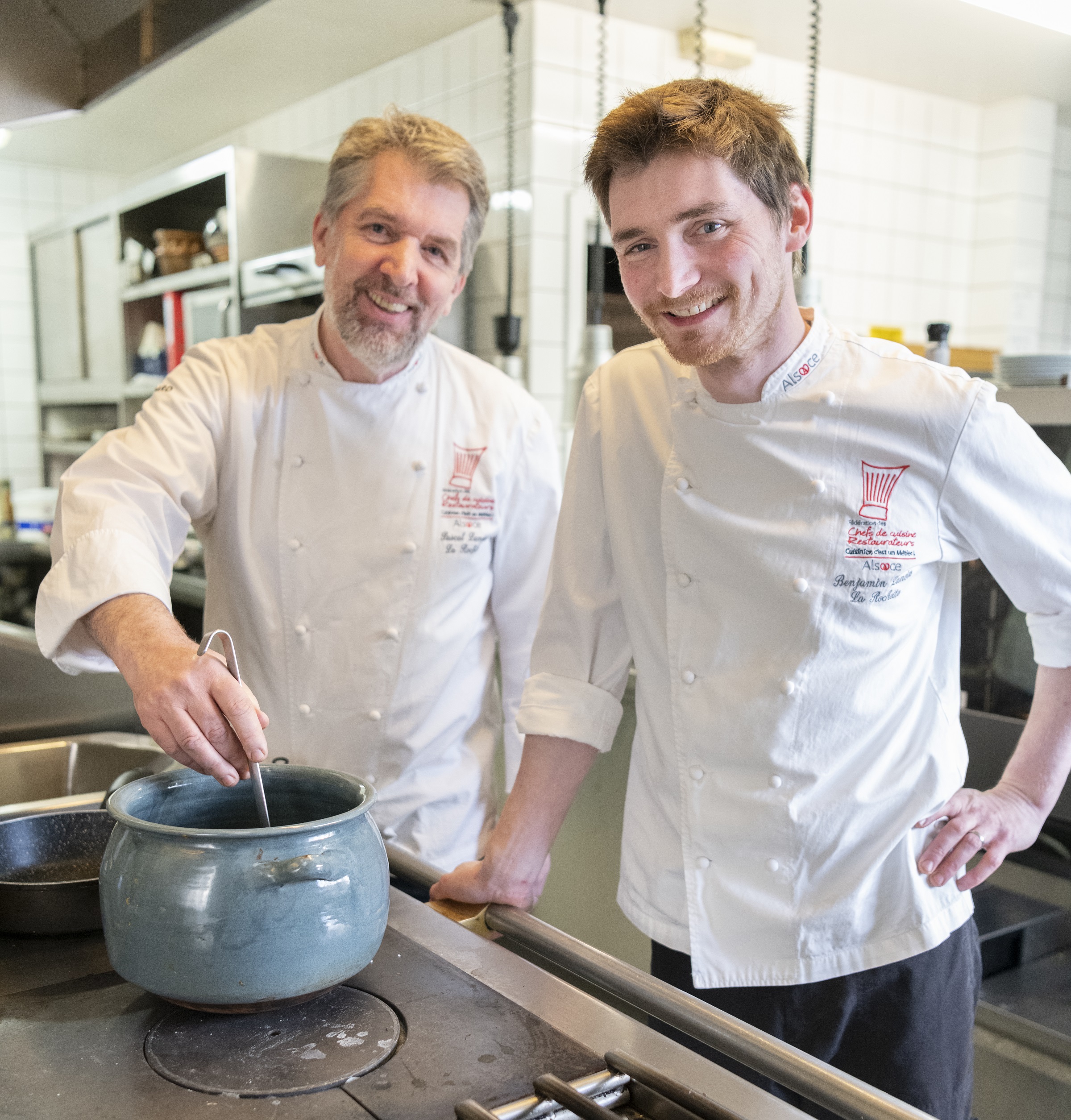 Entre plaine et montagne, cette hôtellerie classée 3 étoiles, complètement remodelée, aux chambres contemporaines et lumineuses, possède une table de renom sous l’autorité de Pascal Lanoix. Ce chef passionné, lauréat de la meilleure matelote d’Alsace, est un amoureux du beau et bon produit qu’il travaille avec précision et respect des saveurs. Dans la salle à manger, aux tables joliment dressées, cette cuisine tout en fraîcheur séduit à coup sûr. Laurence, son épouse, Maxime et Benjamin leurs fils, forment l’équipe gagnante de cet établissement au meilleur de sa forme, qui à d’ailleurs reçu un « bib gourmand » au Michelin en 2012. Spécialités du chef: Marbré de foie gras d’oie & canard maison – garniture de saison, matelote de poissons à l’ Alsacienne, petit Baeckaoffe aux escargots du val d’Orbey.