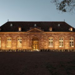 L’été, dans la paisible cour intérieure des Haras, une vaste terrasse prend place devant la somptueuse façade en grès des Vosges, classée au patrimoine de l’UNESCO.