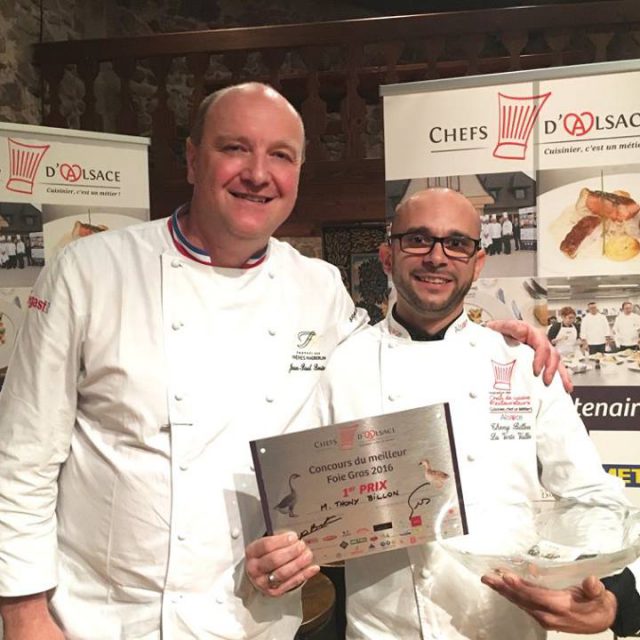 C’est Thony Billon, Chef de l’hôtel-restaurant la Verte-Vallée à Munster qui a remporté le trophée avec son « Etager de foie gras de canard, magret fumé, lard de colonatta, cèpes des Vosges et chutney pomme-cardamome ».